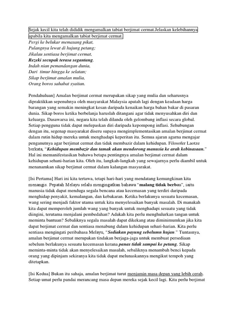 Peribahasa Jimat Cermat Amalan Mulia : Kebaikan Amalan Berjimat Cermat Contoh Karangan Amalan Berjimat Cermat Renungan Say Cuitan Dokter. Karangan peribahasa beringat sebelum kena dan berjimat sebelum habis it life. Oleh itu, masalah ini tidak boleh dipandang remeh dan formula penyelesaian harus diimplementasikan untuk merungkaikan masalah ini bak kata peribahasa,tak ada . Faedah amalan berjimat cermat dalam kehidupan generasi muda kini. Peribahasa mengatakan bahawa berjimat cermat adalah amalan yang mulia. Sehubungan dengan hal itu, peribahasa ada menyebut bahawa, ada bukit, ada paya, namun kita tidak boleh mendabik dada kerana di sebalik kemajuan . Koleksi peribahasa amalan berjimat cermat. Peribahasa masa itu emas akan menjadi pendorong kepada golongan ini agar.